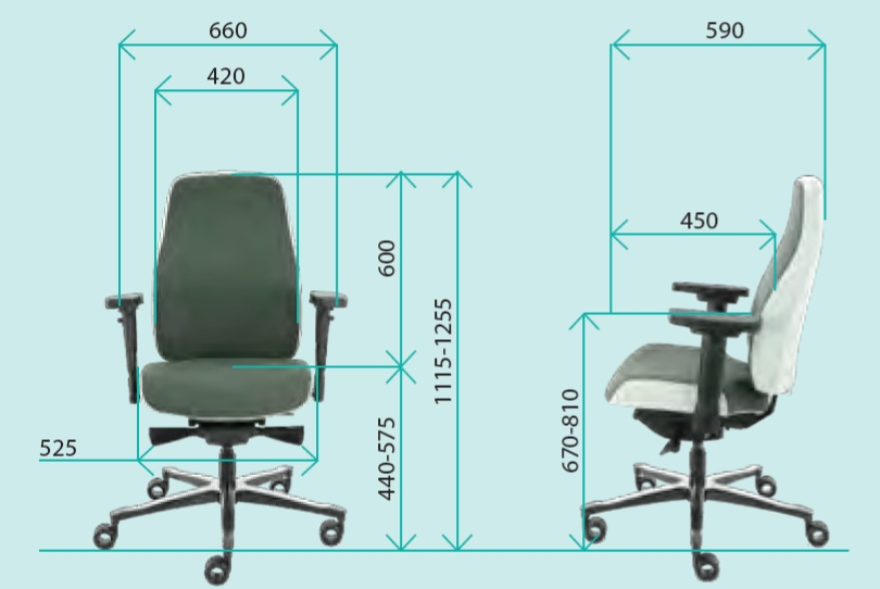 - Tension mechaniek met slinger gewichtsregeling, zitting met negatieve neig 3° en 0°, en 8° rughoekverstelling